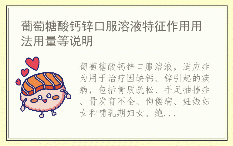葡萄糖酸钙锌口服溶液,适应症为用于治疗因缺钙、锌引起的疾病,包括骨质疏松、手足抽搐症、骨发育不全、佝偻病、妊娠妇女和哺乳期妇女、绝经期妇女钙的补充,小儿生长发育迟缓,食欲缺乏,厌食症,复发性口腔溃疡以及痤疮等。