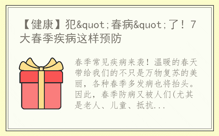 春季常见疾病来袭!温暖的春天带给我们的不只是万物复苏的美丽,各种春季多发病也将抬头。因此,春季防病又被人们(尤其是老人、儿童、抵抗力比较弱的人)提上了重要“日程”。