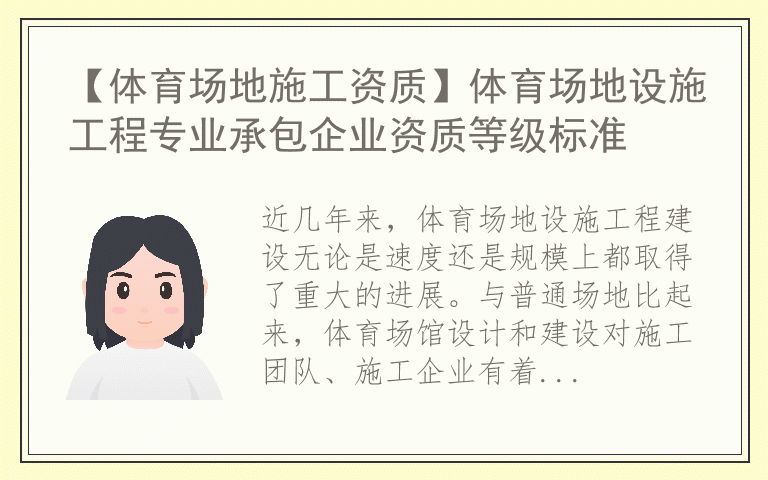 近几年来,体育场地设施工程建设无论是速度还是规模上都取得了重大的进展。与普通场地比起来,体育场馆设计和建设对施工团队、施工企业有着更高的要求。体育场地施工资质有哪些?