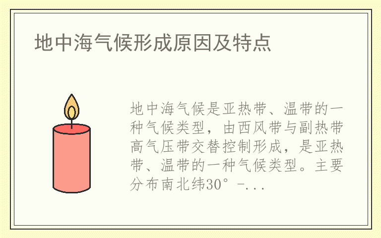 地中海气候是亚热带、温带的一种气候类型,由西风带与副热带高气压带交替控制形成,是亚热带、温带的一种气候类型。主要分布南北纬30°-40°大陆西岸,主要包括地中海沿岸、黑海沿岸、美国加利福尼亚州等地,其中地中海沿岸地区最为典型。具体内容一起来看看了解下吧,希望对你有偶帮助!
