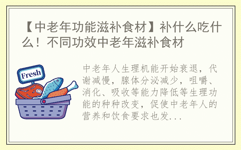 中老年人生理机能开始衰退,代谢减慢,腺体分泌减少,咀嚼、消化、吸收等能力降低等生理功能的种种改变,促使中老年人的营养和饮食要求也发生了改变。一些中老年人由于缺乏相应的营养物质导致各种疾病的出现,因此在日常饮食中要注意对相关物质的补充。