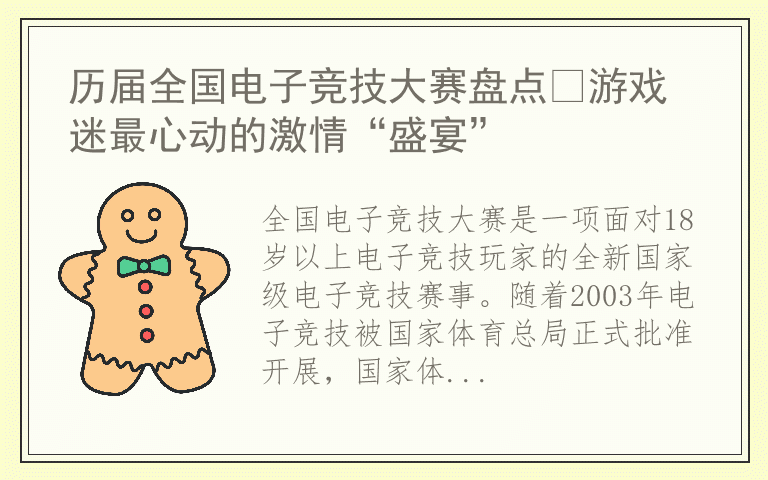 全国电子竞技大赛是一项面对18岁以上电子竞技玩家的全新国家级电子竞技赛事。随着2003年电子竞技被国家体育总局正式批准开展,国家体总对于电子竞技的发展开始逐渐的给予关注和扶持,大型国家级赛事层出不穷。如《英雄联盟》、《王者荣耀》、《穿越火线》等等。