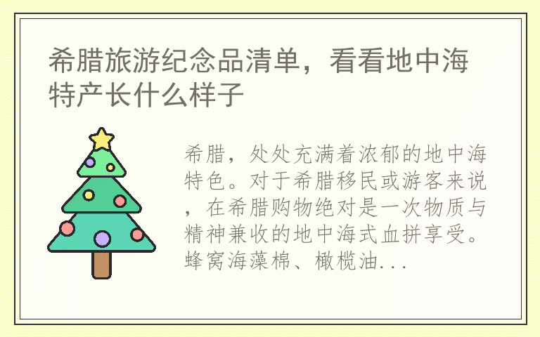 希腊,处处充满着浓郁的地中海特色。对于希腊移民或游客来说,在希腊购物绝对是一次物质与精神兼收的地中海式血拼享受。蜂窝海藻棉、橄榄油、茴香酒等等希腊风味的纪念品值得一买,另外还有充满奥林匹斯神话味道的雕塑也不容错过。