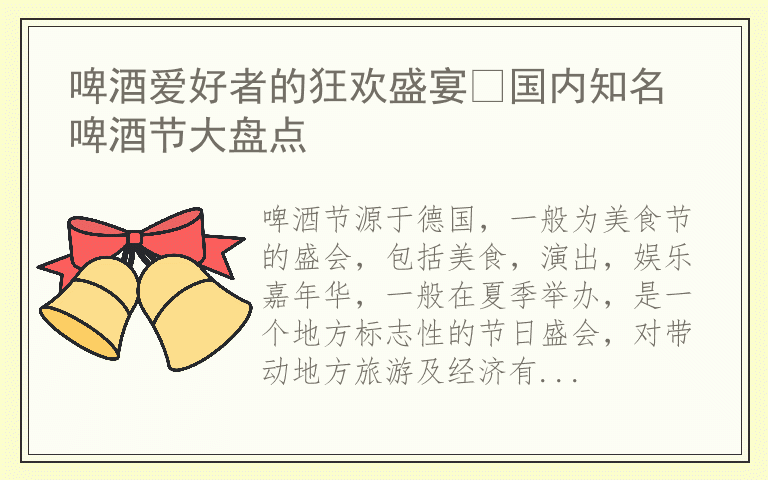 啤酒节源于德国,一般为美食节的盛会,包括美食,演出,娱乐嘉年华,一般在夏季举办,是一个地方标志性的节日盛会,对带动地方旅游及经济有着独特的促进作用。我国也有着很多各种各样的啤酒节,但最出名的还数那几个。